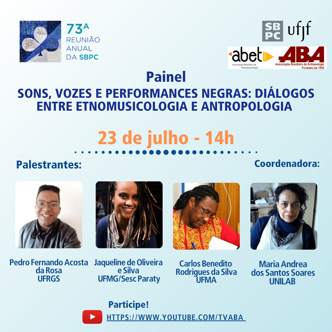 Na sexta-feira, dia 23 de julho, às 14h, a ABET e ABA promovem a mesa-redonda “Sons, vozes e performances negras: diálogos entre Etnomusicologia e Antropologia”. Como palestrantes, a mesa-redonda contará com o professor e pós-doutorando Pedro Fernando Acosta, a doutoranda Jaqueline de Oliveira e Silva e o professor Carlos Benedito Rodrigues da Silva, tendo a professora Maria Andrea dos Santos Soares como coordenadora. A transmissão da mesa-redonda será na TV ABA, neste link (clique aqui!).