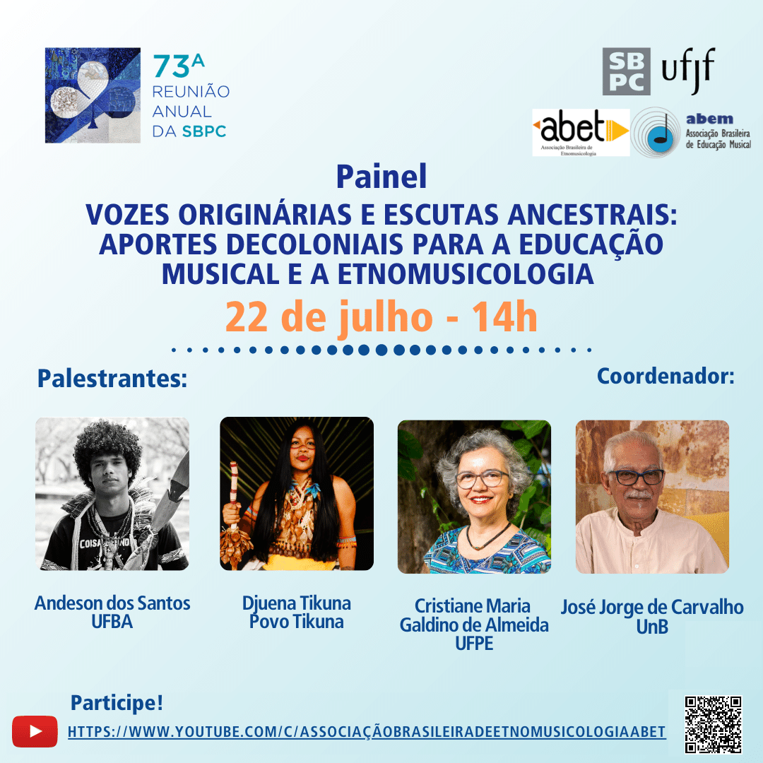 No dia 22 de julho, quinta-feira, às 14h, a ABET e ABEM promovem o painel “Vozes originárias e escutas ancestrais: aportes decoloniais para a Educação Musical e a Etnomusicologia”. O painel terá como palestrantes o doutorando Andeson dos Santos, a artista Djuena Tikuna e a professora Cristiane Maria Galdino de Almeida. A sessão será coordenada pelo professor José Jorge de Carvalho. A transmissão será pelo canal da ABET no YouTube.