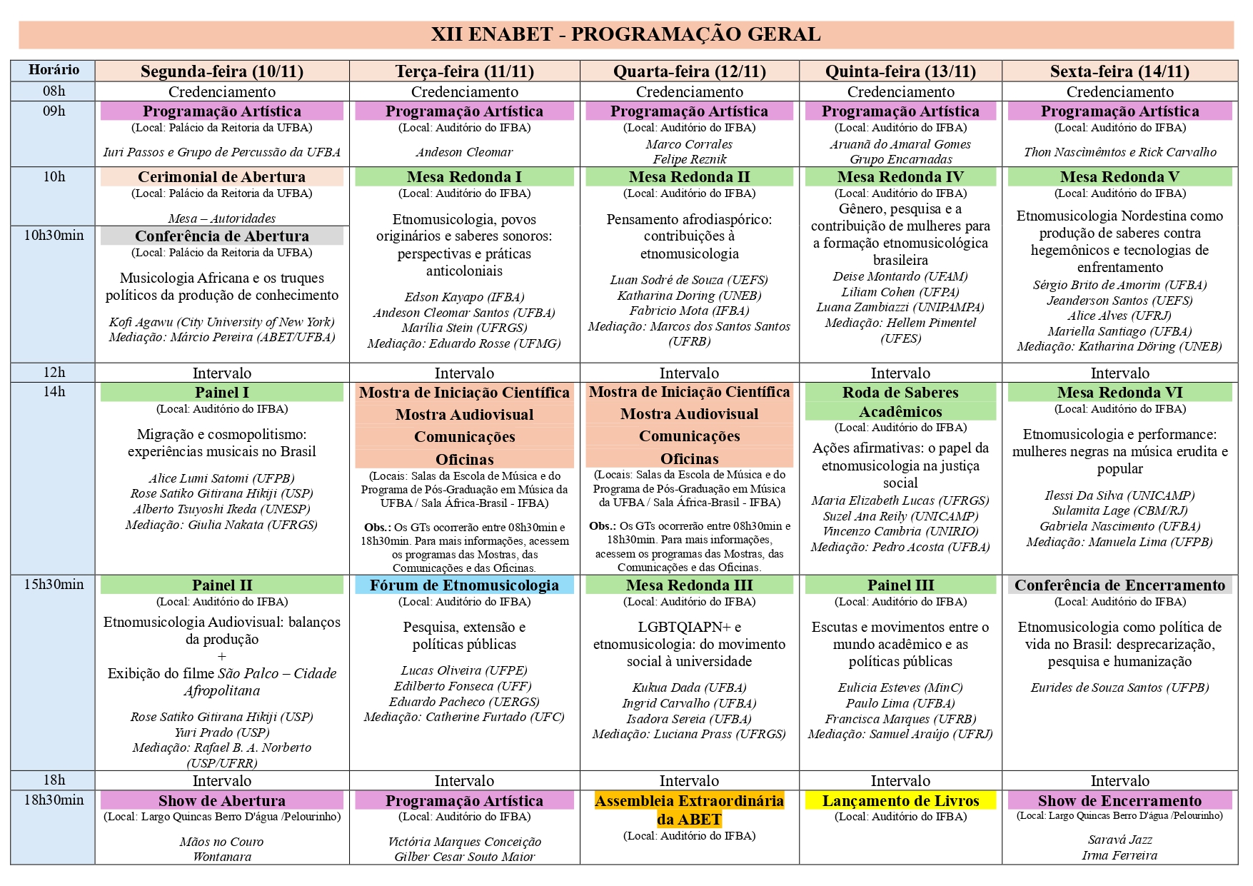 O XII Encontro Nacional da ABET abordará o tema “Etnomusicologia: Saberes, Criatividade e Ações Afirmativas. A programação inclui conferências, mesas-redondas, apresentações musicais, exposições audiovisuais e lançamento de publicações.